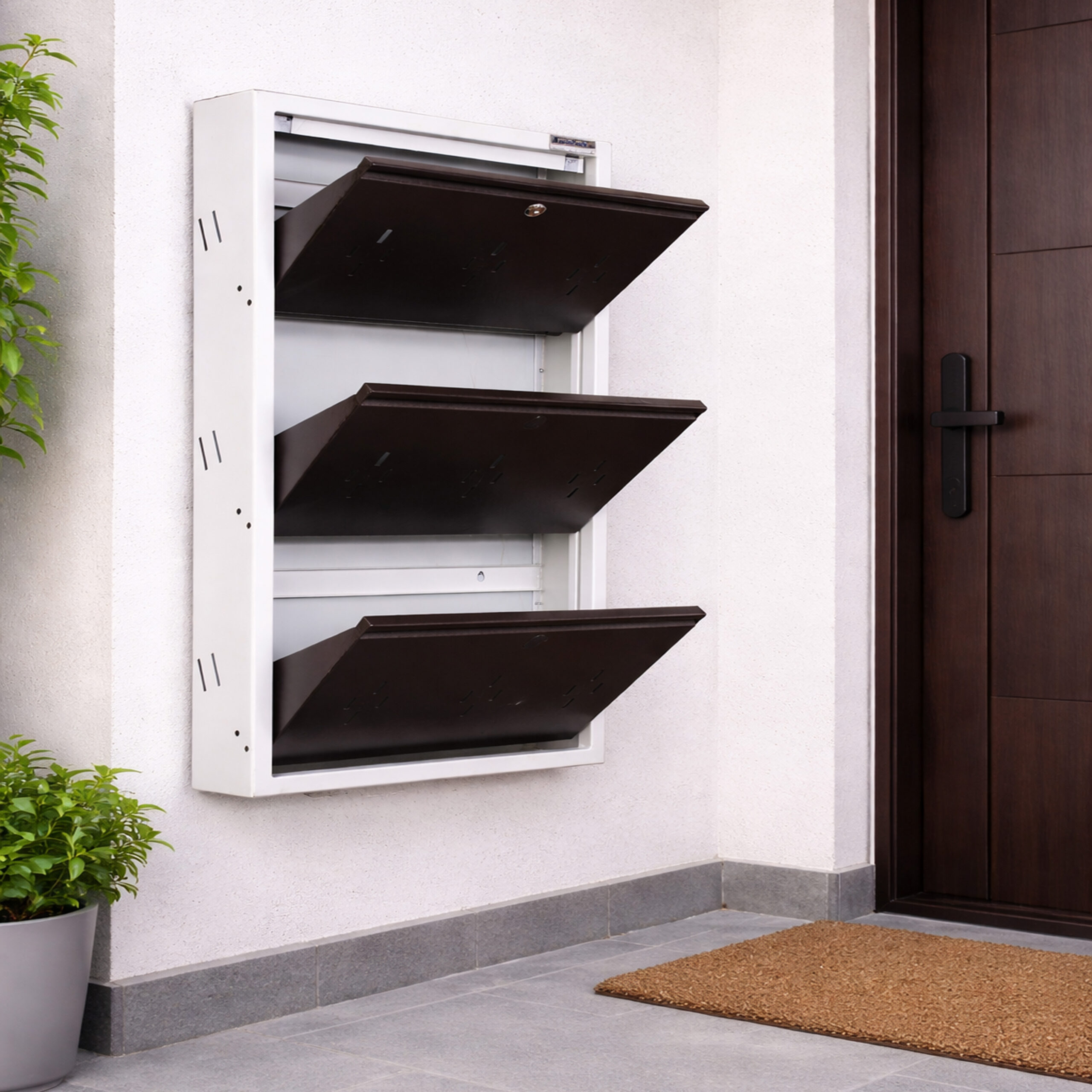 The 3X20 inch wall mounted shoe rack features multiple shelves that can easily store 6-9 pairs of shoes depending on size. Furthermore, the smart flip-open design allows easy access while keeping shoes hidden, giving your entrance a clean and premium look.